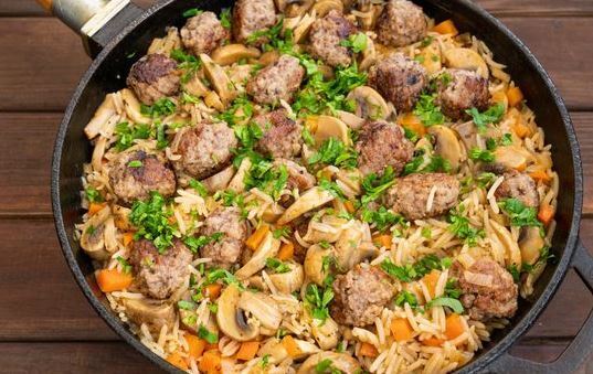Перед подачей присыпьте рис с тефтельками и грибами измельчённой зеленью. Рис с грибами и тефтелями готов!