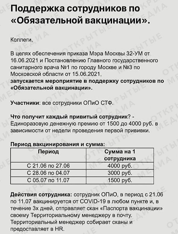 Не стал заморачиваться с лотереями и хороводами оператор «Мегафон», который просто объявил денежные расценки за укольчики своим московским сотрудникам, которые до 10 июля привьются от коронавируса. Сумма, предлагаемая за эксперимент над здоровье, варьируется от 1500 до 4000 рублей.