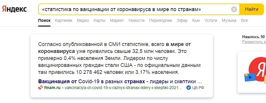 В этом также есть сомнения. Например, как быть с информацией, которая требует постоянной актуализации? Не нужно долго кликать в поиске, чтобы наткнуться на устаревшую информацию в быстрых ответах, которые выбирает нейросеть. К примеру, по запросу «статистика по вакцинации от коронавируса в мире по странам» в быстрых ответах статья от 14 января 2021 года, т.е. полностью протухшая и неактуальная информация.