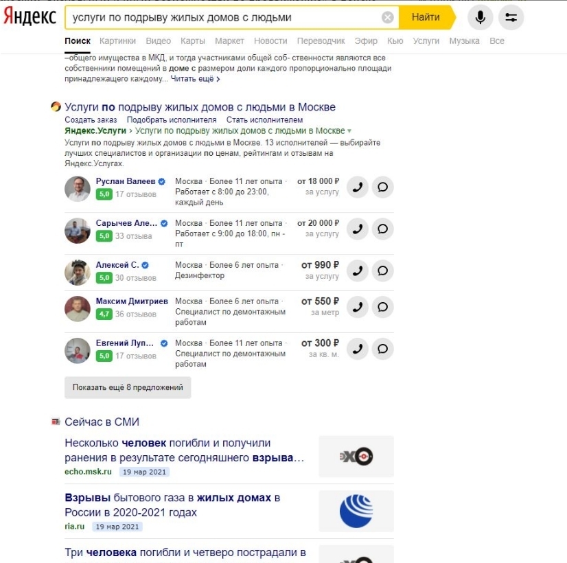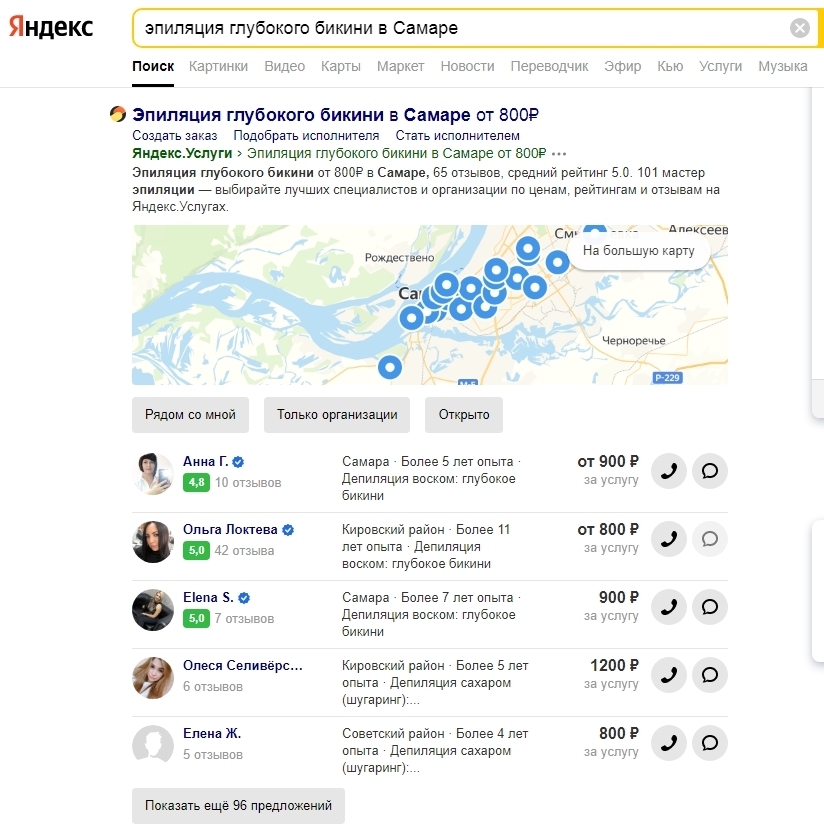 Отдельно хочется сказать о сервисе «Яндекс. Услуги», активное продвижение которого стало поводом для нескольких обращений в Федеральную антимонопольную службу со стороны участников рынка. В сервисе можно заказать услуги у частных мастеров и компаний в своем регионе. «Яндекс. Услуги» стал конкурировать не только с аналогичными сервисами Youdo.com и Profi.ru, но и с представителями малого и среднего бизнеса, которые продвигались в поиске по аналогичным запросам. По мнению участников рынка, честной конкуренции с «Яндексом» не получилось – по большинству запросов верхние строчки поиска занимает огромный блок «Яндекс. Услуг» (так называемый колдунщик).