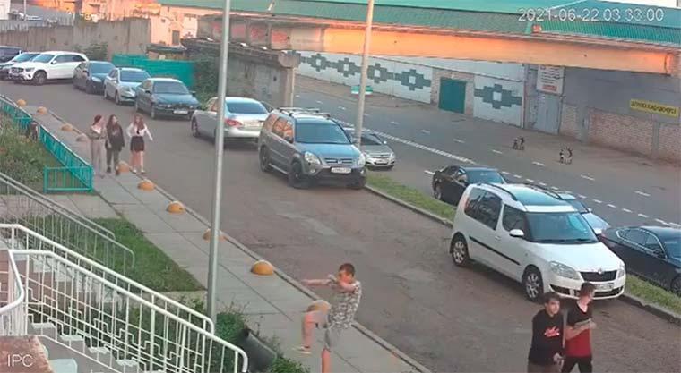 Пока пострадавший корчился от боли, прижимая руки к области паха, а девушки помогали ему подняться с земли, второй юноша решил «отомстить» за друга и ударил в нижнюю часть мусорной урны. Однако и он получил отпор. Удар края металлической урны пришёлся ему в область колена.