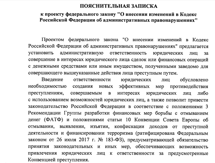 Как поясняют в Кабмине РФ, введение ответственности обусловлено необходимостью создания новых эффективных мер противодействия преступлениям, совершаемым в интересах юрлиц либо с использованием возможностей юрлиц. Также это позволит привести российское законодательство в соответствие с рекомендациями Группы разработки финансовых мер борьбы с отмыванием денег (ФАТФ) и положениями Конвенции СЕ об отмывании, выявлении, изъятии, конфискации доходов от преступной деятельности и финансировании терроризма.