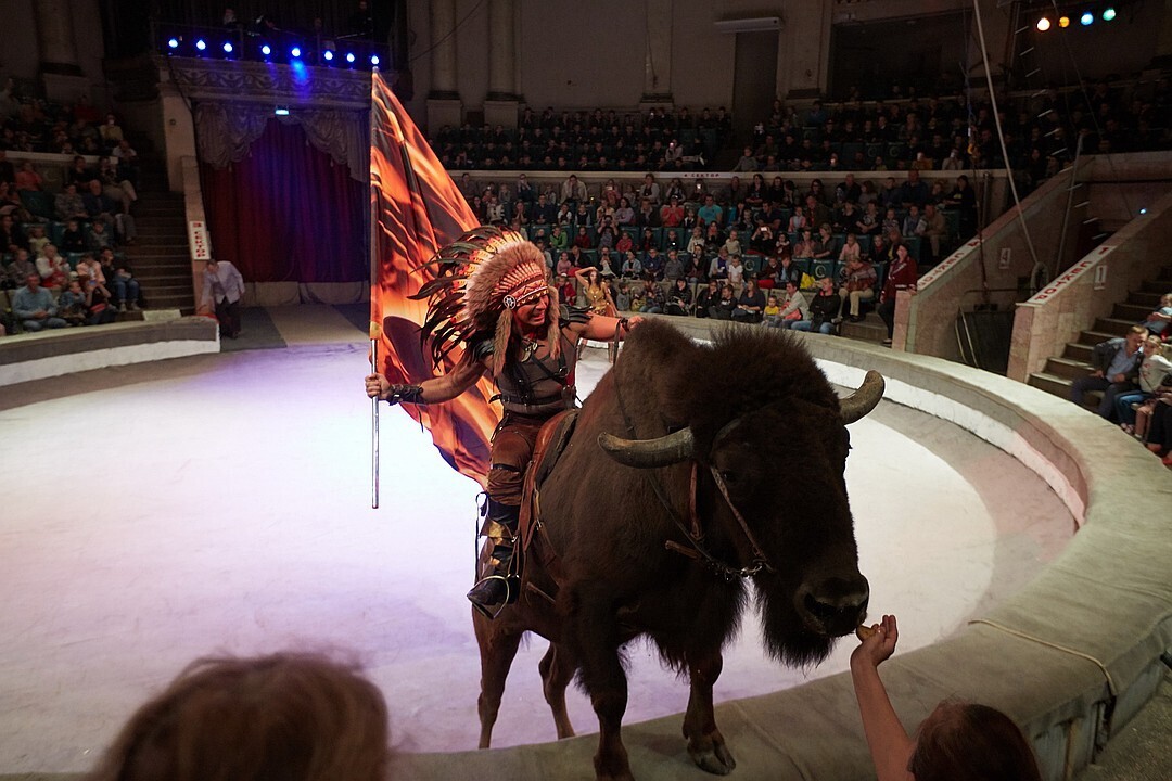Особое место в программе занимает дрессированный и оседланный индейцем буйвол
