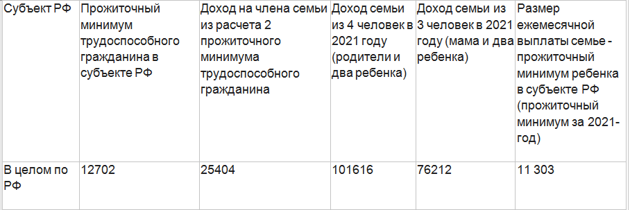 Чтобы понять, имеет ли семья право на ежемесячные выплаты из материнского капитала, необходимо посчитать, какой доход приходится на каждого человека в семье, и сравнить с прожиточным минимумом трудоспособного населения в регионе. Для этого общий доход семьи за год делится на 12 месяцев и на всех членов семьи: 810 000. рублей / 12 месяцев / 4 человека = 16 875 рублей на одного человека в месяц.