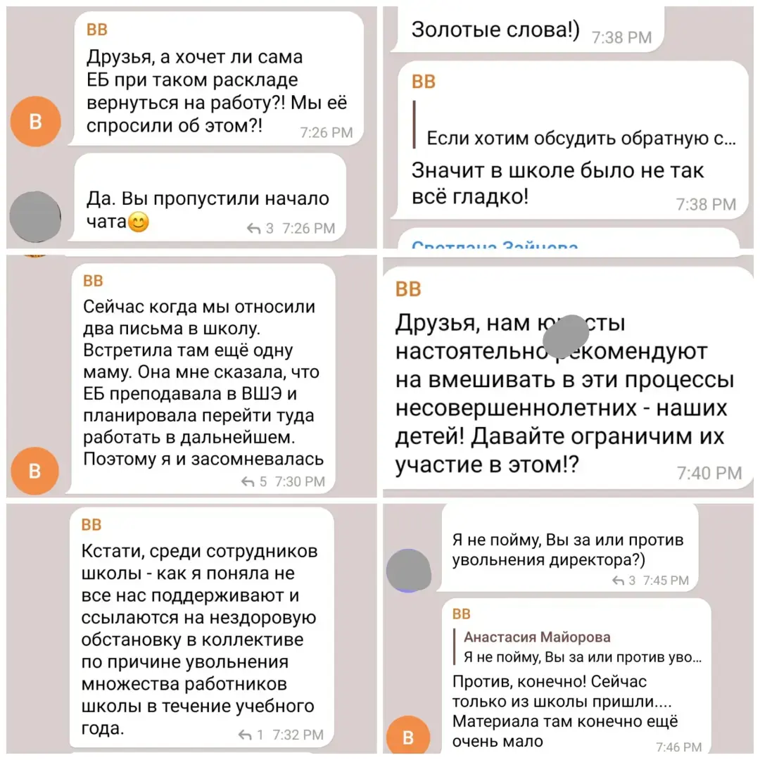 После составления открытого письма, 20 июня, в родительском Telegram-чате появился пользователь под именем ВВ, который стал отговаривать участников чата от открытой поддержки директора.
