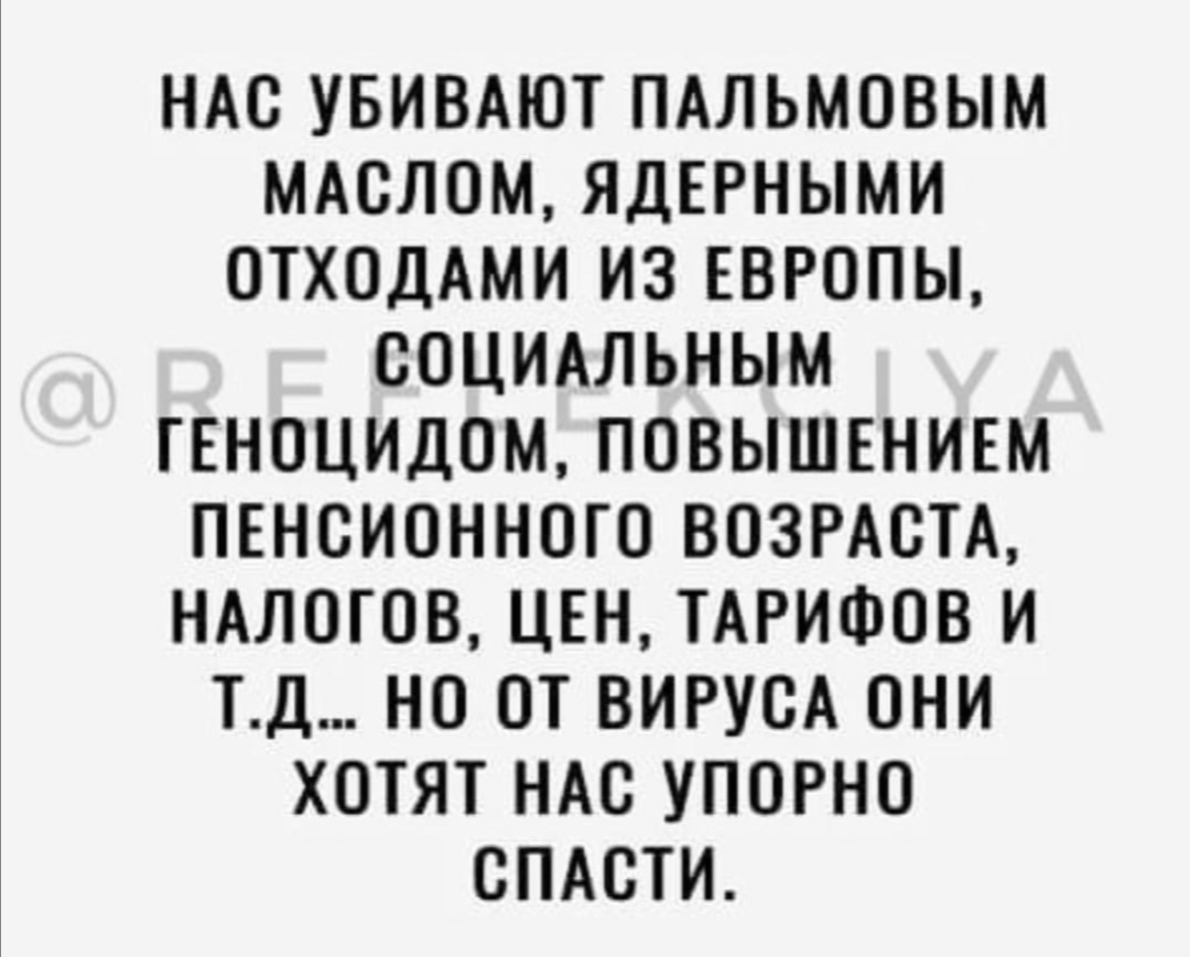 Так. Стоп. Это вакцина готовая или экспериментальное лекарство? Я себя в подопытные кролики не записываю. А кому говорят, что вакцина экспериментальная? Почему об этом открыто не говорят? Почему все сми поют, что мол люди вакцину нашу лучшую в мире не хотят себе колоть, а должно быть так: нашу лучшую в мире экспериментальную вакцину никто на себе за свой счет и за счет своей жизни испытывать не хочет! Почему нам везде со всех щелей льют в уши, что вакцина готова? Тогда у меня еще больше вопросов! Какого хрена я себе должна колоть не испытанную вакцину?! За такое создатель вакцины несет ведь ответственность! Должен. А у нас что? Бумажку под нос сунули, пробурчали, что если вы умрете медленной и мучительной смертью, то учтите, что вакцина, лучшая в мире, здесь не причем. Так с чего бы? Почему заставляют людей участвовать в эксперименте? Насильно. Шантаж - это насилие. Я так понимаю, что наши законотворцы Конституцией нашей подтираются там в думе в туалете. А маразм все крепчал...
