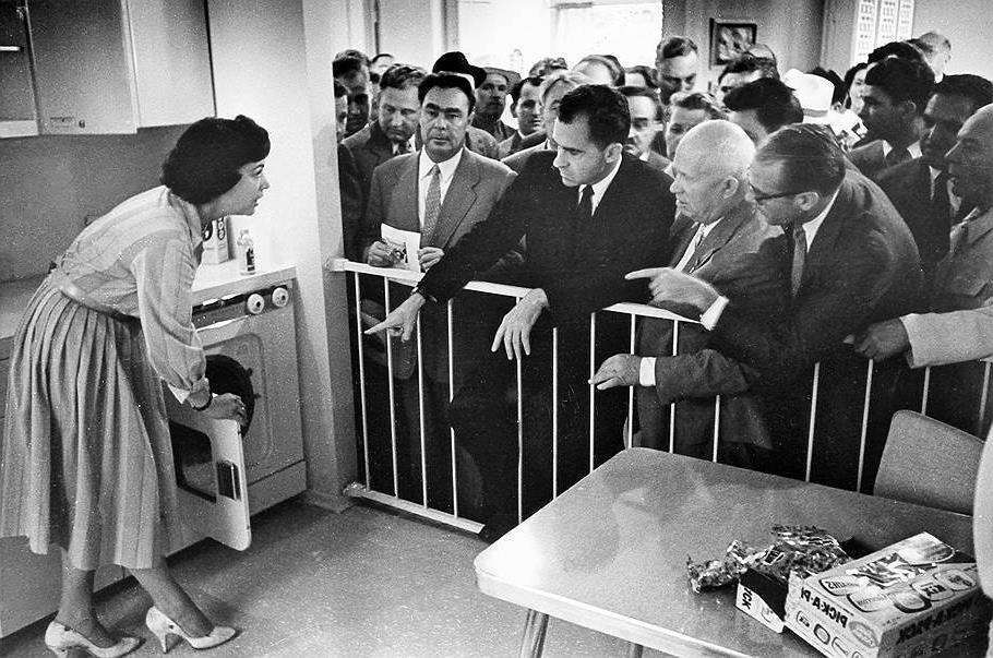 Хрущёв в дискуссии подчёркивал, что промышленность Советского Союза ориентирована не на производство предметов роскоши, а на производство действительно значимых товаров, на изобилие бытовой техники он отреагировал саркастическим комментарием: «А у вас нет такой машины, которая бы клала в рот еду и её проталкивала?»