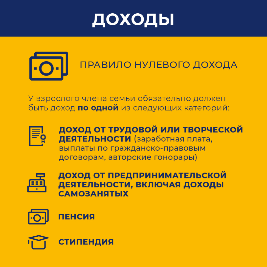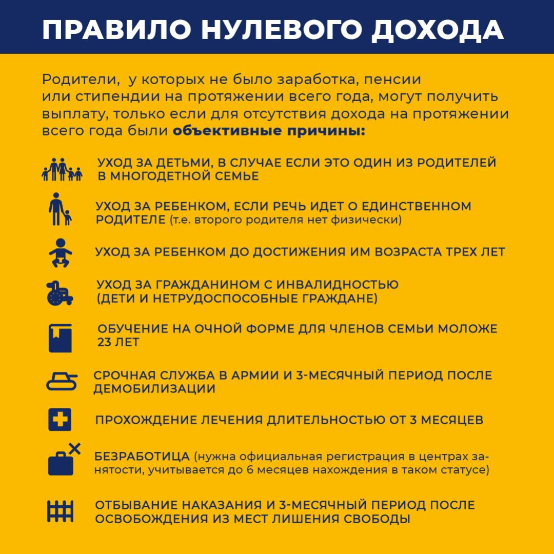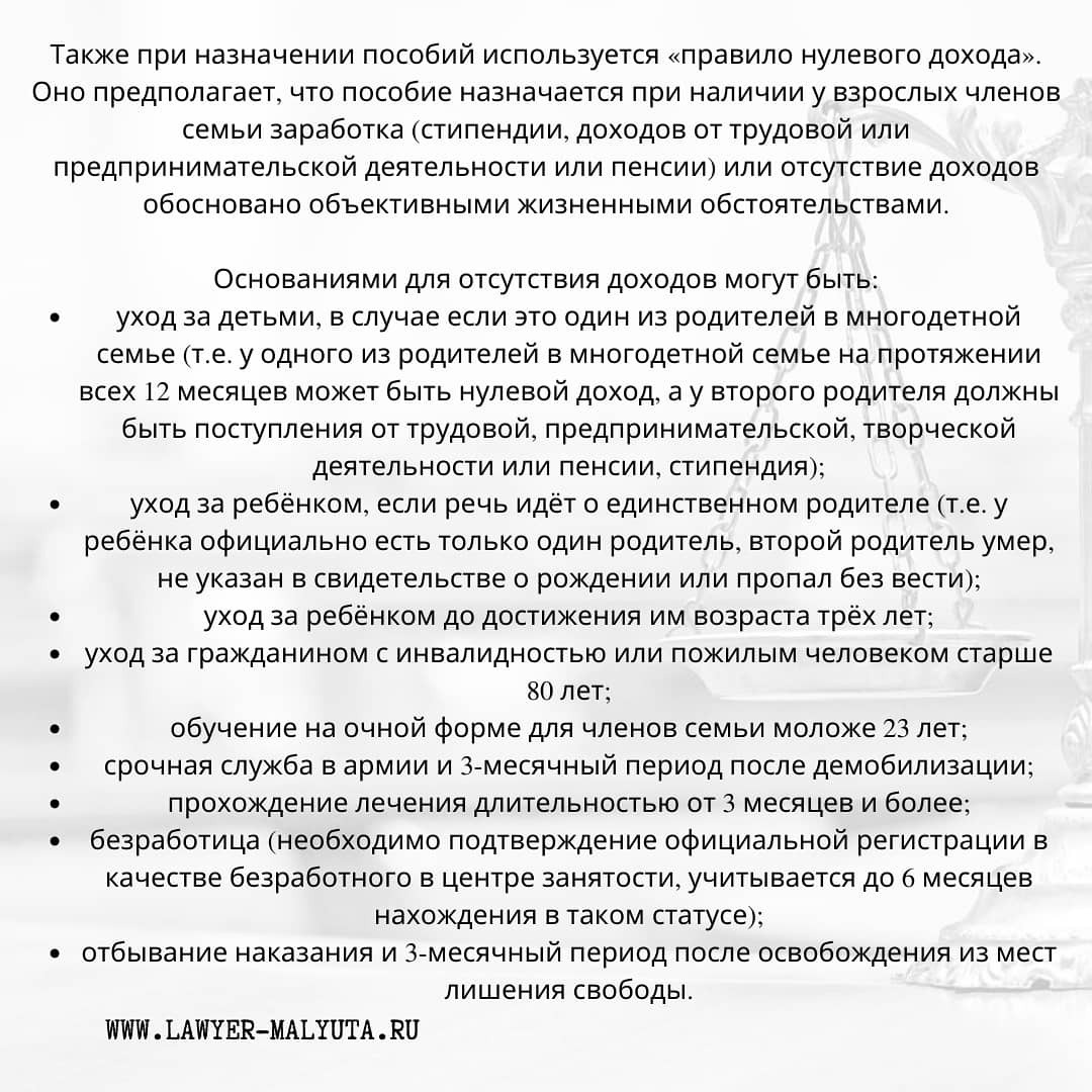 -если суммарно у родителей отсутствовал доход по объективной причине на протяжении не более 10 месяцев из 12, то пособие будет назначено, несмотря на "нулевой доход".