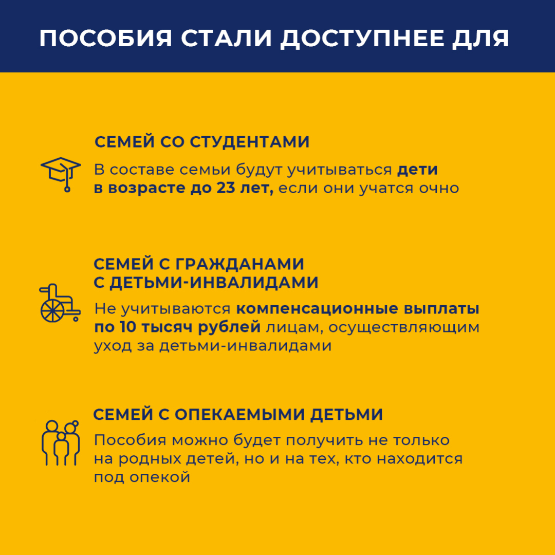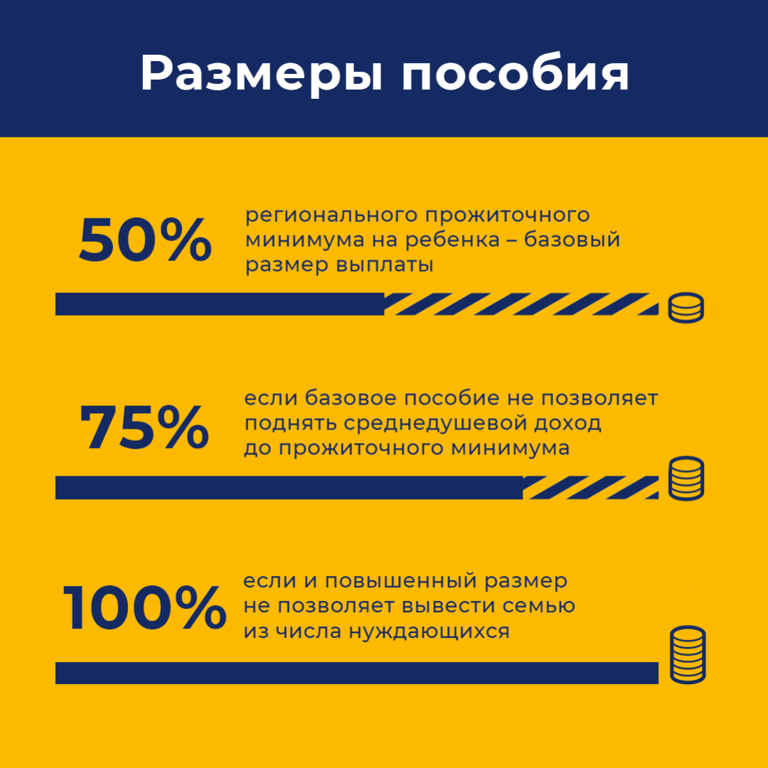 С 1 января 2021 года введена трехступенчатая система начисления пособия - 50%, 75% и 100% от регионального прожиточного минимума для детей.