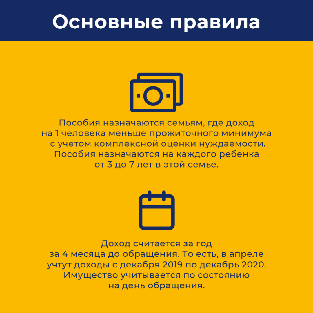 В 2020 году семьи, чей среднедушевой доход был ниже регионального прожиточного минимума, получали пособие в размере 50% от регионального детского прожиточного минимума. В среднем по стране эта сумма составляла 5 500 рублей.