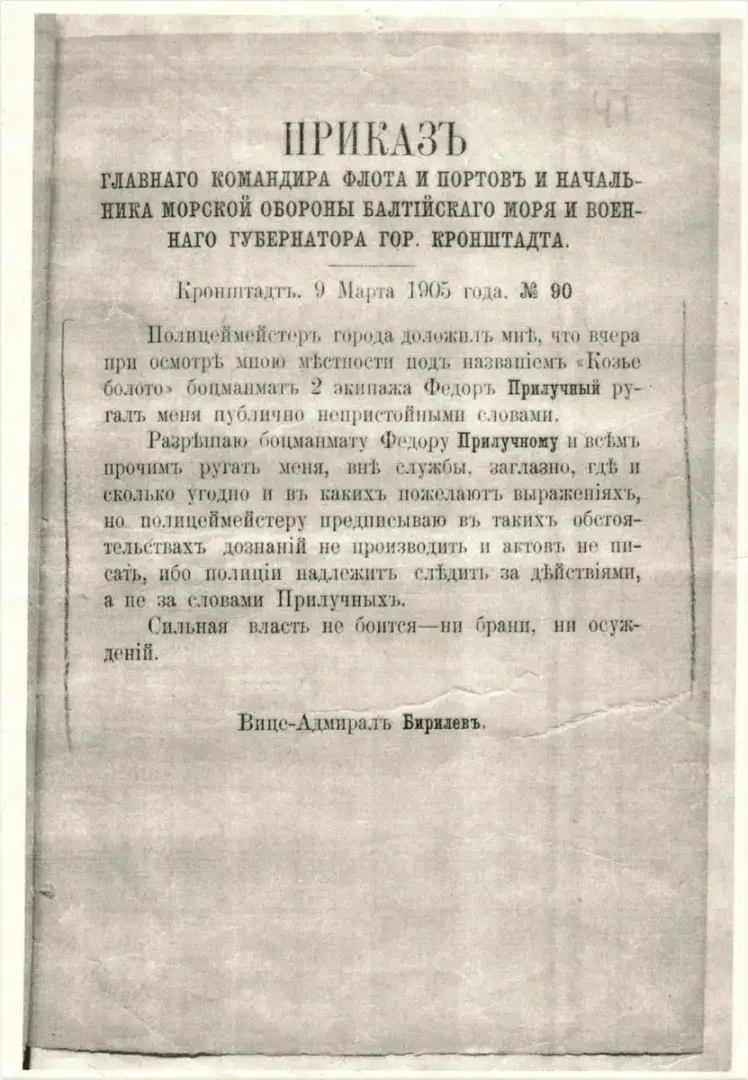 Пример первый: Приказ военного губернатора города Кронштадта, вице-адмирала Бирилева от 9 марта 1905 года: