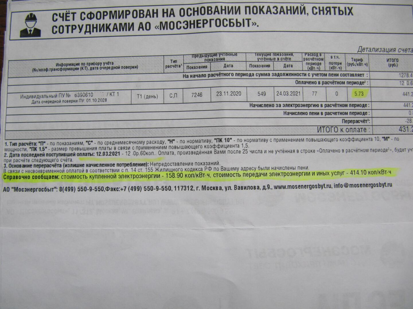 Удивительно, но все, кому мы показывали эту квитанцию (аналогичные квитанции получают почти все граждане России), удивлялись тому, что мы вам здесь объясним. На фото мы поместили квитанцию, которую распространяют в Московской области, разделяющую столицу и другие области России, чтобы не обижать провинцию Московскими квитанциями. На квитанции мы видим загадочную запись (выделена жёлтым маркером) мелким шрифтом, где цены показаны не просто в копейках, а даже в сотых долях копейки: «Справочно сообщаем: стоимость купленной электроэнергии – 158.90 коп/кВт. ч, стоимость передачи электроэнергии и иных услуг – 414.10 коп/кВт. ч.».