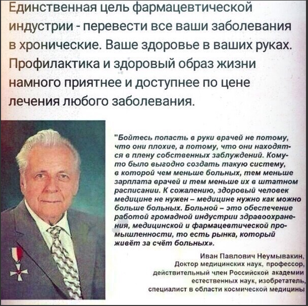 «Представьте, что “нормальная” острая респираторная вирусная инфекция, при которой возникает относительно высокая температура тела, приводит к своеобразной чистке организма. Она убивает токсины, которые там накопились и могут вызвать онкологическое заболевание. Теперь сопоставьте количество прививок, которые делают населению, то, что люди не заболевают, как положено ОРВИ, и количество роста динамики онкологических заболеваний. Понимаете? Вдруг, на самом деле причина в этом? От того, что мы стали массово делать эти прививки, у нас, например, растёт онкология".