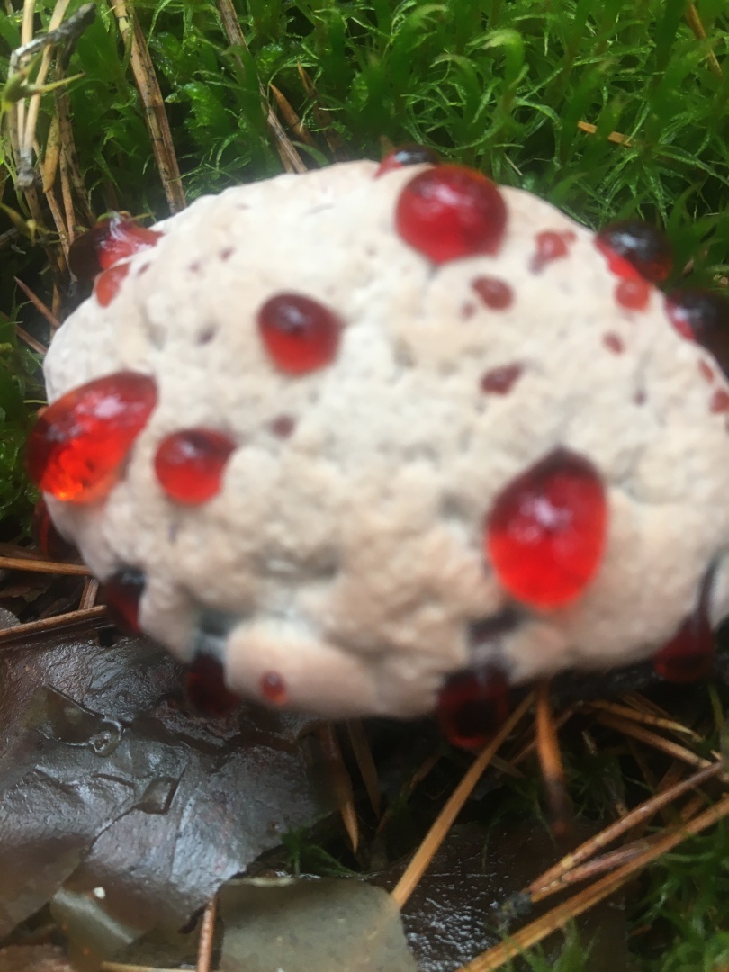 А вот такие видели?))) На пироженку похож) Это Гиднеллум Пека,он-же дьявольский гриб)), он же дьявольский зуб))). 100% процентная летальность от яда, но при этом этот яд возможно станет заменителем пенициллина и гепарина). А его настойкой хорошо синяки сводить)). А ещё он ест насекомых и немного пахнет клубникой)). Как раз после дождей появляются такие красивые капельки))) яда))). К осени становится тоже красивого чернильного цвета)).