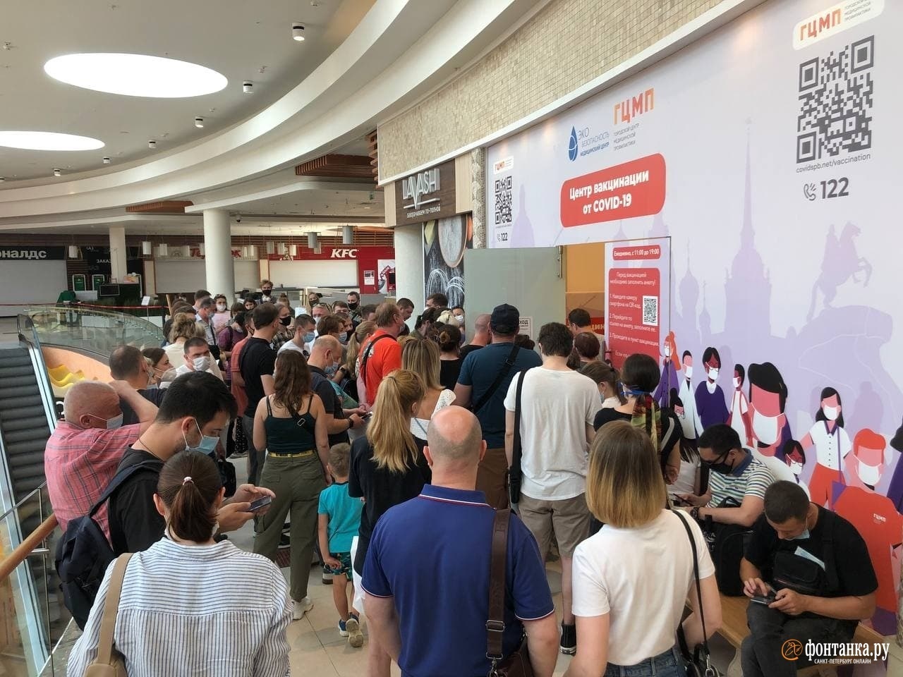 Многие из внезапно осознавших ценность укола не разбираясь отправились в торговые центры, где ожидаемо встали в очереди. Мобильным пунктам там не хватает ни вакцины, ни мощности — в «Невском центре», например, планировали вакцинировать всего по 200 человек в день, а к ним хотят тысячи. Из-за этого местами цепочки из желающих привиться в ТЦ растянулись на восемь десятков человек.