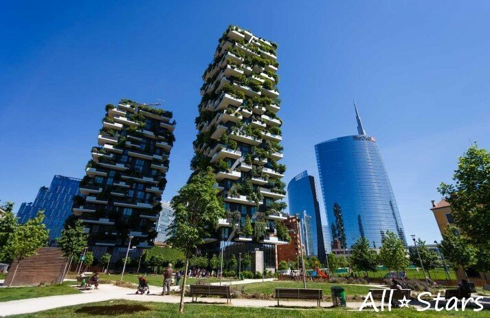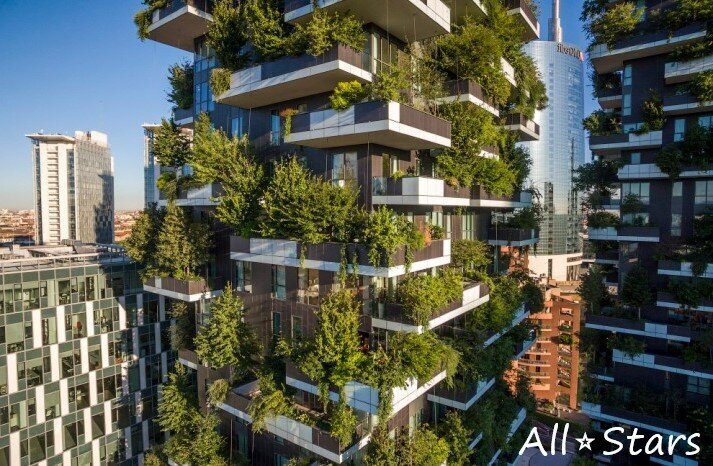 Bosco Verticale – настоящий вертикальный лес. В целом, это жилой массив с двумя башнями высотой 110 и 76 метров. На них расположены около 500 деревьев, виноградных лоз и кустарников.