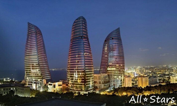 Это самые высокие здания в Азербайджане. Снаружи здание покрыто светодиодными экранами, показывающими движение огня, которое видно даже в самой дальней части города.