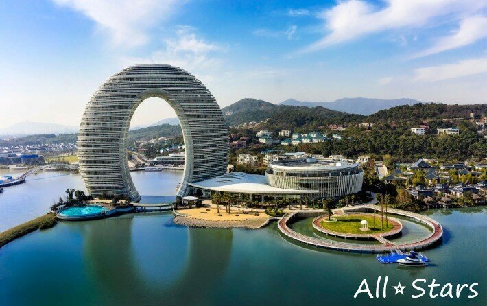 Отель Sheraton Huzhou расположен на берегу озера Тайху. Также известен, как "Яркая луна". Необычная форма 30-этажного здания – инженерная мера, позволяющая снизить вес всей конструкции.