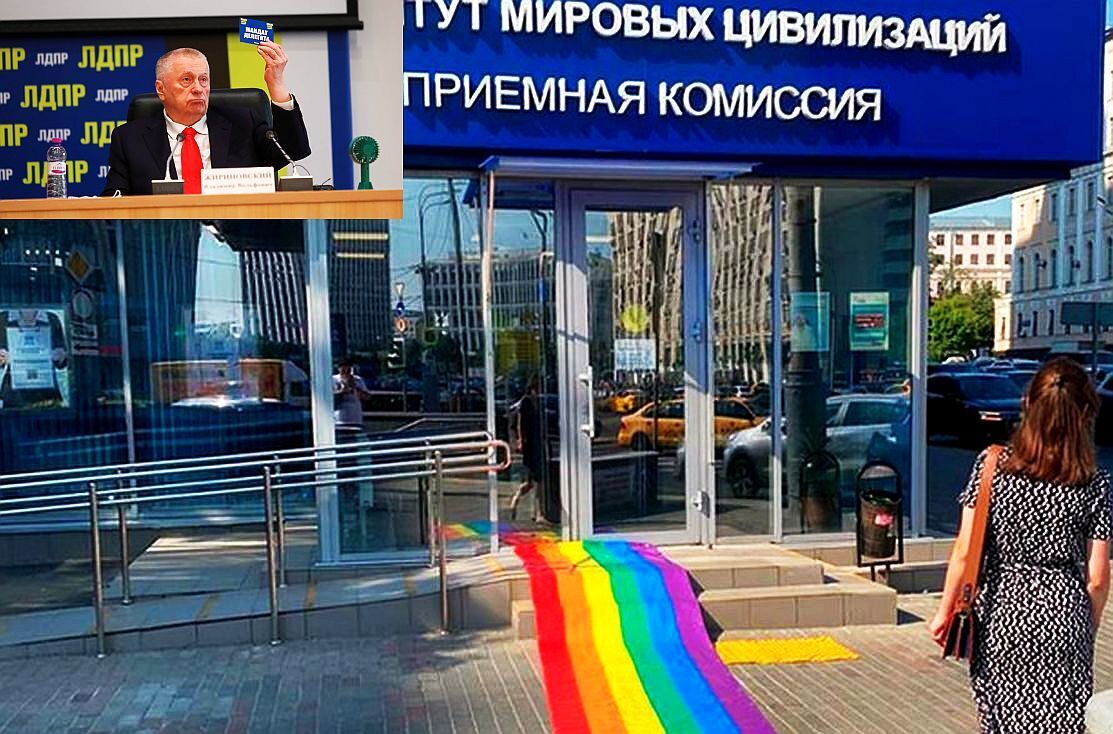 На фото представлено изображение главного входа, принадлежащего Жириновскому частного образовательного учреждения "Институт мировых цивилизаций" (ИМЦ). 25 июня там стартовал XXIII предвыборный партийный съезд ЛДПР, на котором утвердили стратегию и партсписки либерал-демократов на предстоящих думских выборах-2021 в сентябре. Красивая, радужная дорожка расстелена для самых желанных гостей партийно-интимного мероприятия.