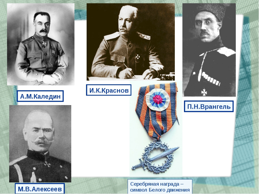 Общего языка не нашли даже белые генералы. Генерал Краснов не хотел подчиняться Деникину. Атаман Семенов, опираясь на Японию, создал в Забайкалье собственное правительство и игнорировал приказы верховного главнокомандующего адмирала Колчака. Донские, кубанские и терские казаки, так и не пошли за генералами и стремились к созданию собственных государств без власти красных комиссаров и белых помещиков.