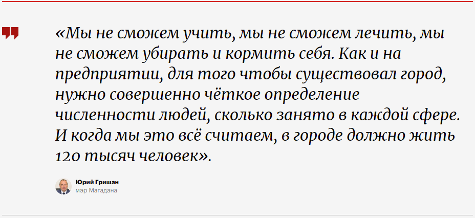 Мэр Магадана Юрий Гришан заявил, что город не сможет себя обслуживать, если его численность упадёт ниже 85 тысяч человек.