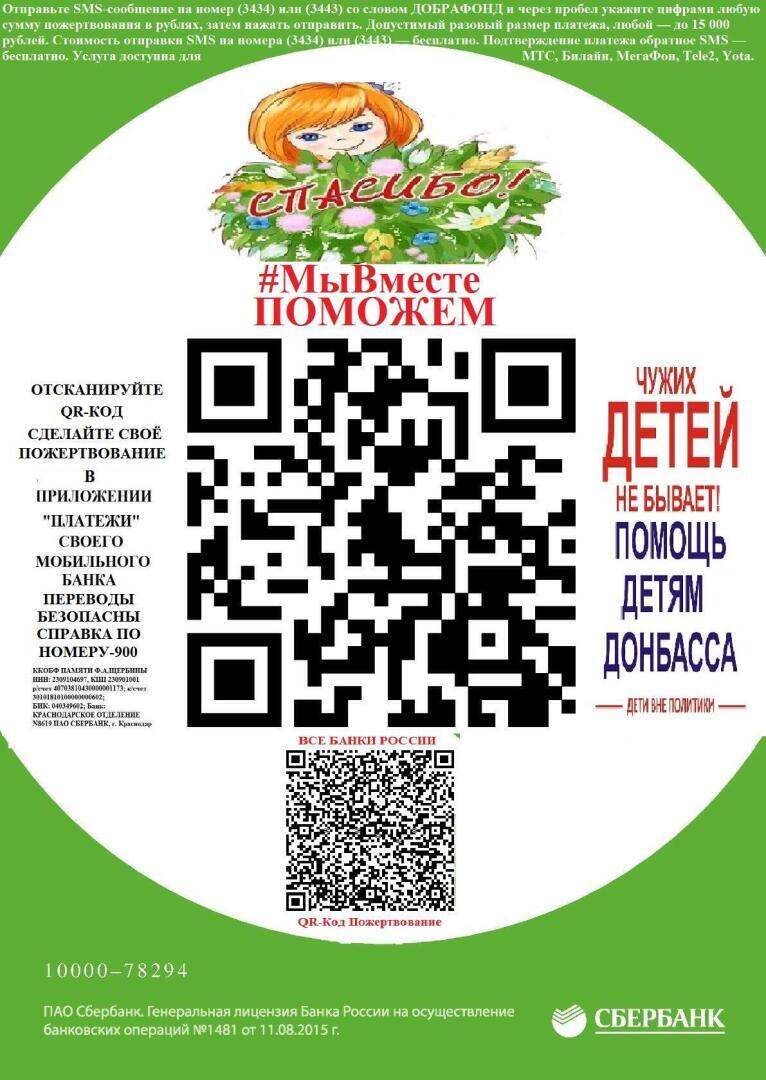 Оказать помощь отправь SMS-на номер (3434) или (3443) со словом ДОБРАФОНД, через пробел укажите цифрами любую сумму пожертвования в рублях. Допустимый размер платежа, любой — до 15 000 рублей. Стоимость отправки SMS на номера (3434) или (3443) — бесплатно. Подтверждение платежа обратное SMS — бесплатно.