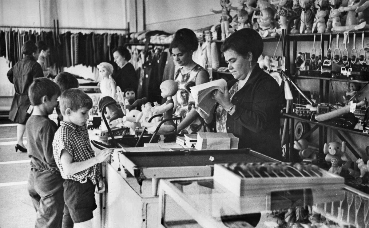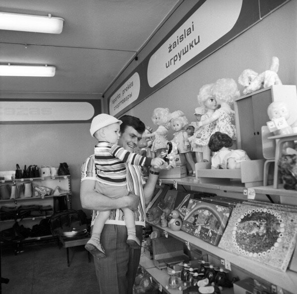 60-е годы, магазин "Игрушки" на Колхозном рынке города Кулебаки. Мне кажется, что продавцы показывают женщине куклу-новинку, потому что сзади на полках во всей красе куклы-старинки))) А ребёнку купили слоника, а не мишку))) Как же я любила наш дачный магазин размером с вагончик. Там тоже было всё вместе - и куклы, и Пушкин))) А то у мамы на работе умумкаешься рассматривать в ГУМе товар на трёх линиях и двух этажах. Я там даже иногда плутала)))