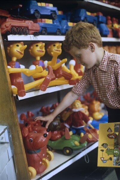 Детский мир города Кузнецка, 70-е. Какое-то просто пластиковое изобилие. И неваляшки! Моя мечта детства, мне очень хотелось заиметь неваляшку, но мама так и не купила. И правильно сделала, потому что у все знакомых эти ненужные игрушки стояли вечно на шкафах без дела) Куплю себе старую ёлочную игрушку в виде неваляшки и закрою гешальт