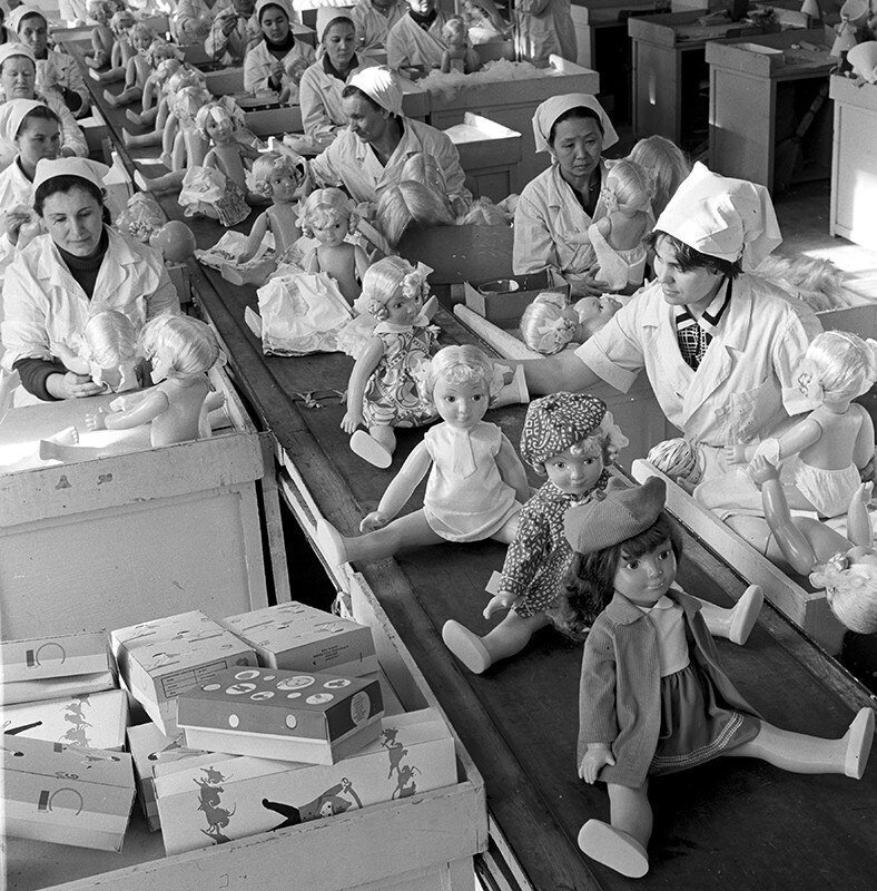 Сегодня я совсем другими глазами смотрю на игрушки СССР. Не все, конечно, но многие очень достойные экземпляры. Посмотрите только на этих красавиц. Кукольный конвейер на Алма-Атинской фабрике игрушек, 1970-е годы. Какие модные куклы - плащи, береты.