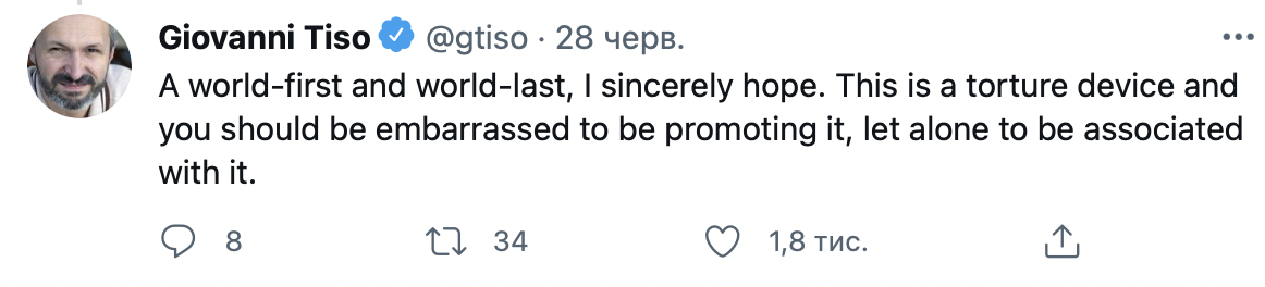 «Это орудие для пыток, и вам должно быть стыдно рекламировать его, не говоря уже о том, чтобы быть связанным с этим», — комментирует устройство пользователь сети.