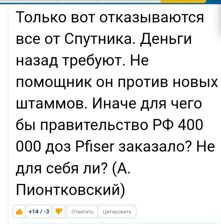 Добрый вечер, Андрей. Я такого рода информацию не замечала, но если это так, то меня больше интересовал бы другой вопрос. Почему пфайзер вообще закуплена...Получается, посчитали, что этой вакцине можно доверять. Хотя предположить, что и она не была компетентно исследована - логично.