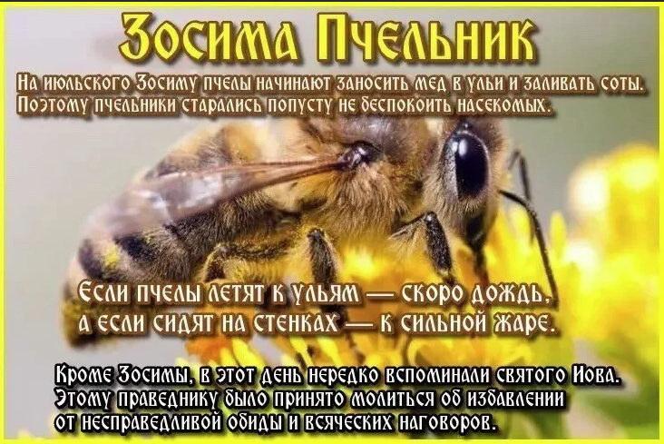 В русском народном календаре несколько дней Зосимы, и все они тем или иным образом связаны с пчелами. В частности, на июльского Зосиму пчелы начинают заносить мед в ульи и заливать соты. Поэтому пчельники старались попусту не беспокоить насекомых; если же доводилось пройти мимо улья, нужно было произнести заговор: «Рой, гуди, в поля лети! С поля домой возвращайся — медок неси!».