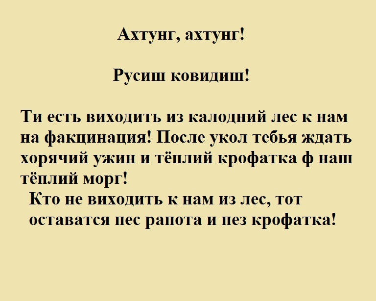 Сегодня, на мой взгляд, происходит то же самое, что и в годы ВОВ. Вероломно, без объявления войны фашисты вторглись на территорию нашей страны. Страна превратилась в концлагерь. Народ подвергают психологической обработке и биологическим экспериментам. А теперь, у нас украли право проживать в своем доме, если власти объявят угрозу ЧС.