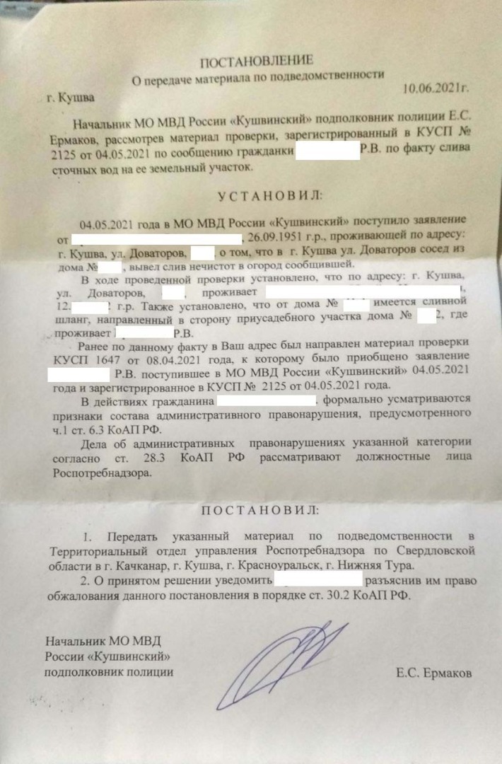 После выражения недовольства «сверху», поскольку жалобы и материалы в прессе побеспокоили высокое руководство, сотрудники полиции Мо МВД "Кушвинский" … вы думаете привлекли виновных к ответственности? Отнюдь! Они решили «спихнуть» это дело из своего ведомства, придав этому некоторую видимость законности. В результате, в недрах этого полицейского ведомства родился следующий документ: