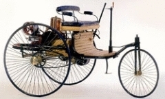 Карл Бенц сконструировал свой автомобиль в 1885 году. Он представлял собой трехколесный двухместный экипаж на высоких колесах со спицами. На него Бенц поставил свой новый четырехтактный бензиновый мотор с водяным охлаждением рабочим объемом 984 см 3 и мощностью 0,9 л.с. Единственный цилиндр располагался горизонтально по продольной оси машины над осью огромных задних колес. 3 июля 1885 года были проведены первые испытания автомобиля.