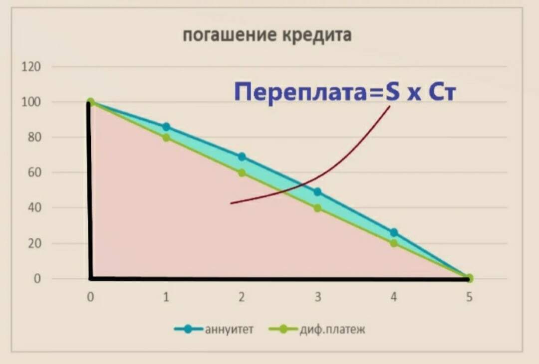 Площадь под кривой как раз и будет сумма переплаты. При аннуитете кривая лежит выше, а значит и сумма переплаты будет больше.
