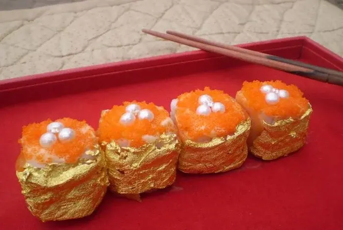 Чем же эти суши отличаются от остальных? Во-первых, это нигири-суши, которые завернуты в нежнейшие пластинки из 24-каратного золота. Во-вторых, каждый кусочек украшен 12 редкими жемчужинами и 4 африканскими бриллиантами весом в 0,2 карата. Что касается начинки, то она готовится из таких ингредиентов: