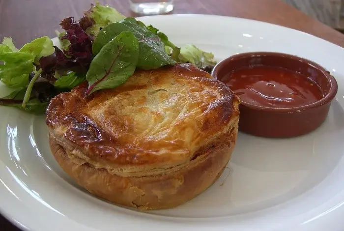 В ресторане Fence Gate Inn, расположенном в Великобритании, готовят мясной пирог с мраморной говядиной Вагю (Wagyu). Это очень дорогой вид мяса, который получают из японских быков, которых разводят по особой технологии – сначала выпасают на лугах, а после обездвиживают, дают специальное пиво и даже делают массаж. В итоге, получается очень нежное мясо с жировыми прослойками высокой степени мраморности.