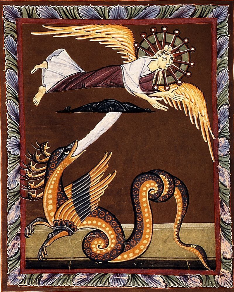 Жена убегает от дракона (миниатюра Бамбергского Апокалипсиса, XI век)