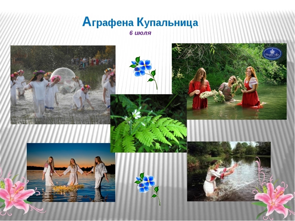 На Аграфену все жители деревни — и стар, и млад — купались в реках, мылись в банях, употребляя при этом разные травяные сборы. Считалось, что собранные в ночь на Ивана Купалу травы и коренья обладают особенной целебной силой. Из уст в уста передавалась легенда о цветке папоротника, который распускается один раз в году, в эту волшебную ночь, и всего на несколько минут. Тот, кто его найдет, сможет стать провидцем и получит способность находить клады.