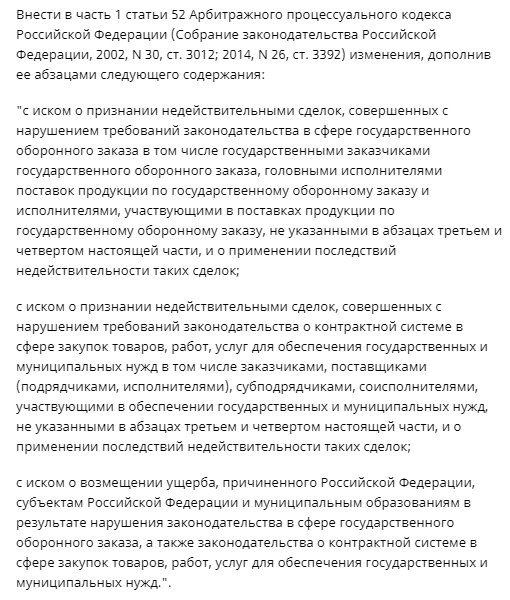 Прокуроры смогут подавать иски в суды о нарушениях при выполнении гособоронзаказа, а также закупок для государственных и муниципальных нужд. Соответствующие поправки внесены в часть 1 статьи 52 АПК РФ.