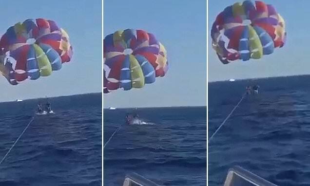 Акула выпрыгнула из воды и укусила висящих над водой на парасейлере людей. Видео