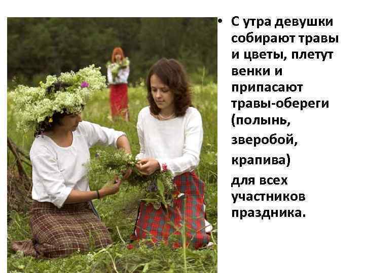 Купальские обряды, совершаемые в канун праздника («ночь накануне Ивана Купалы»), составляют сложный обрядовый комплекс, включающий: сбор трав и цветов, плетение венков, украшение зеленью построек, разжигание костров, уничтожение чучела, перепрыгивание через костер или через букеты зелени, обливание водой, гадания, выслеживание ведьмы, ночные бесчинства.