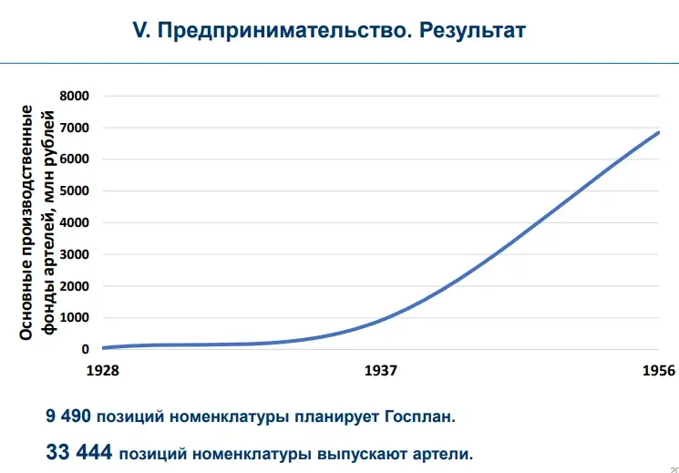 Развитием малого и среднего бизнеса занималось руководство кооперативного движения, так называемые Советы промкооперации. Они были прямо заинтересованы в росте кооперативного движения и артельного производства. И в то же время несли ответственность перед государством за его развитие, то есть совмещали контрольные и созидательные функции. Разительный контраст по сравнению с сегодняшним временем, когда малый и средний бизнес подвергается настоящему проверочному террору и запугиванию со стороны силовых органов., преследующих, естественно, чисто свои ведомственные, а часто и явно своекорыстные цели.
