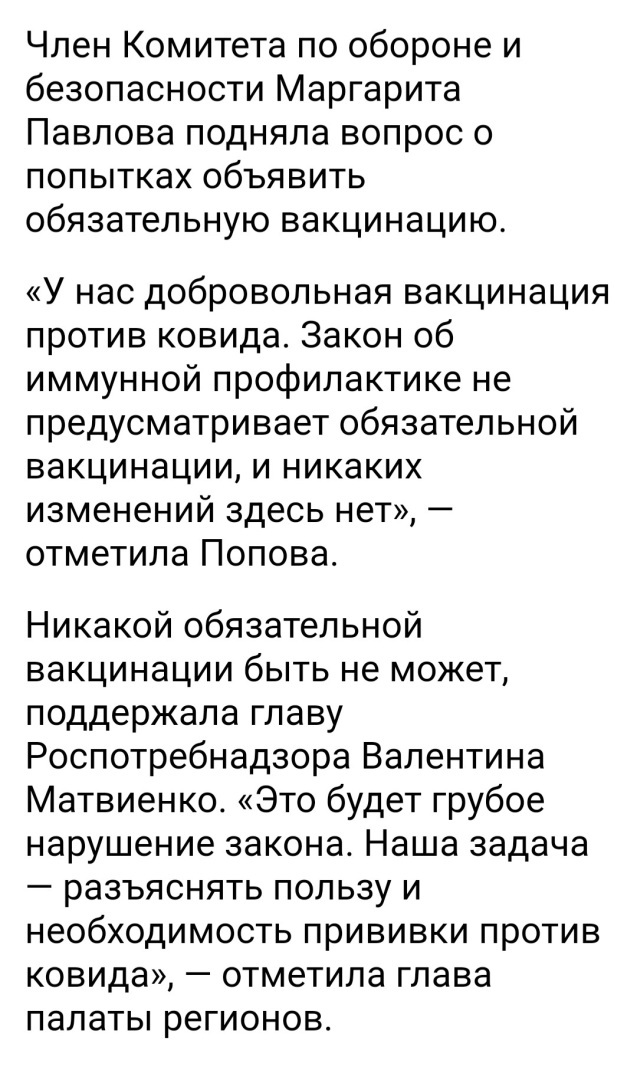принудительной . одни вопросы ответов нет .это ответ сенатору члену комитета по обороне и безопасности Маргарите Павловой и это уже после принудительной вакцинации 👇👇👇 . где правда и кому верить ?(полную версию можно посмотреть в интернете в свободном доступе )