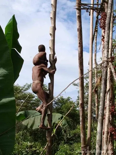 И строительство средств подъема это тоже особая технология. Здесь и лестницы из лиан и особые столбы с насечками и разные приспособления для подъема грузов.