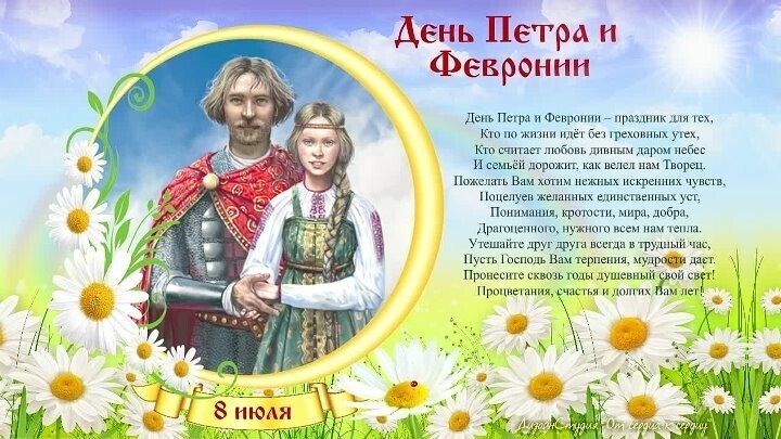 Святых Петра и Февронию Муромских почитают в народе как покровителей семейного очага, хранителей супружеской любви. По легенде, будущий муромский князь Петр заболел проказой, от которой нигде не мог найти излечения. Однажды он увидел сон о том, что помочь ему сможет крестьянка Феврония из Рязанской земли. Девушку разыскали, и Петр дал обещание, что женится на ней, избавившись от болезни. Но не сдержал слово. Болезнь возобновилась, и только после того как Феврония вновь вылечила Петра, он, наконец, исполнил обещанное — и никогда об этом не пожалел.