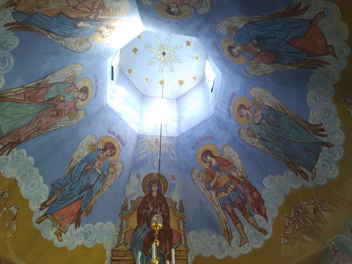 Храм в стиле сибирское барокко. Но основная особенность – расписан храм вовсе не красками). Он расписан цветной глиной, в которую добавляли яичный белок для крепости. Существует даже специальная школа росписи глиной. Расписывала новый храм художница Лариса Кононова, которая так же расписывала наш оперный театр.