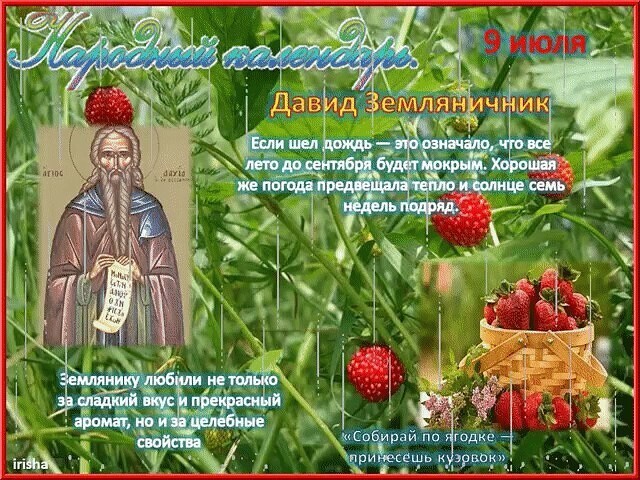 Земляничником преподобного Давида на Руси прозвали за то, что в его именины в лесу созревают первые ягоды. Землянику русские люди всегда любили, особенно дети — для них она была одним из главных лакомств. Об этой ягоде сложено множество поговорок — например, такая: «Первую ягоду в рот кладут, а вторую в дом несут». Что в народе хотели этим сказать, понятно: трудно удержаться от соблазна отведать первую поспевшую землянику, а уже после, утолив голод, можно заняться и заготовкой ягод.
