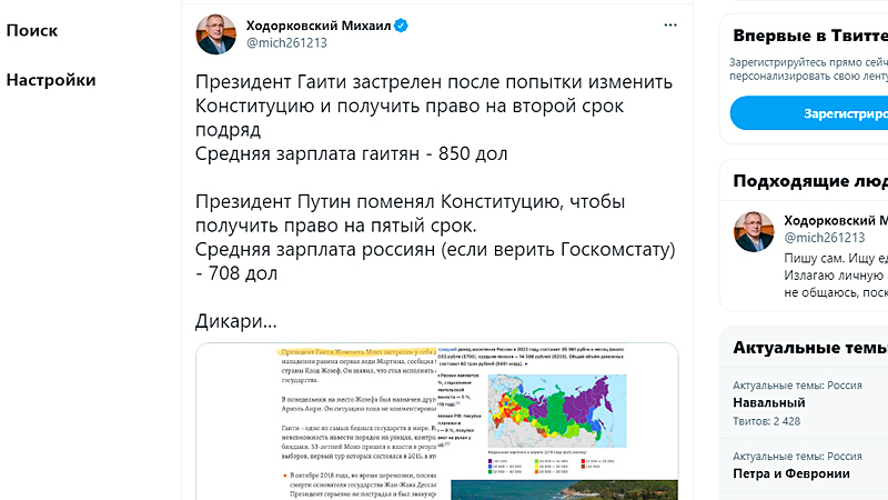 Средняя зарплата в России, как указал товарищ Ходорковский – 708 долларов США. Это он конвертировал сумму средней начисленной заработной платы по итогам 2020 года по данным Росстата. Не соврал, хотя к реальному уровню жизни эта цифра имеет мало отношения. Про Россию не соврал, а про Гаити не смог себе отказать. А может быть, не смог найти информацию: мне понадобилось ровно минута, чтобы понять, откуда Ходорковский взял эти 850 долларов гаитянской зарплаты. Сайт с такой информацией почему-то возникает первым в выдаче Гугла, если вы наберёте в поиске "средняя зарплата в Гаити".